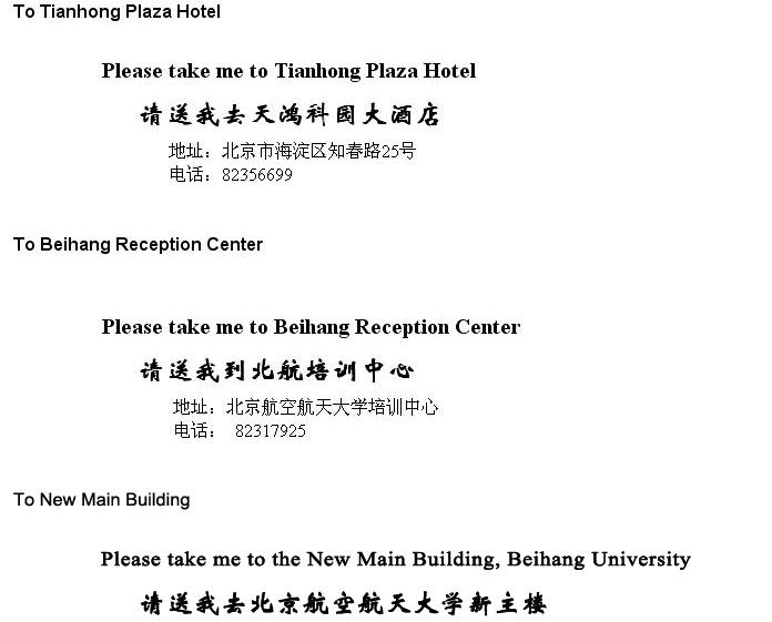 The Beijing Capital Airport is about 30 kilometers away from the conference site. You may take either taxi or shuttle bus there to your hotel. If you arrive on September 19 and would like to have some assistance at the airport, please inform Mr. Xiaoyu Chen the time of your arrival with flight number. Someone will meet you at the airport and help ask a taxi to send you to your hotel (in this case, you should look for someone holding your name at the exit of the arrival hall).The taxi fares in Beijing are quite affordable and you pay exactly the amount shown on the taximeter. It costs about 100 CNY from the Capital Airport to your hotel. You are advised to keep the receipt, which could help you find the driver when necessary. You may print these notes and show them to taxi drivers.